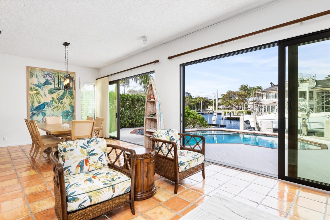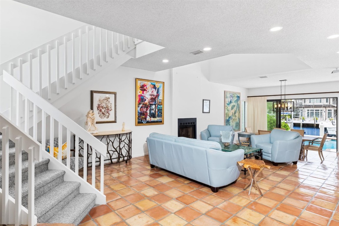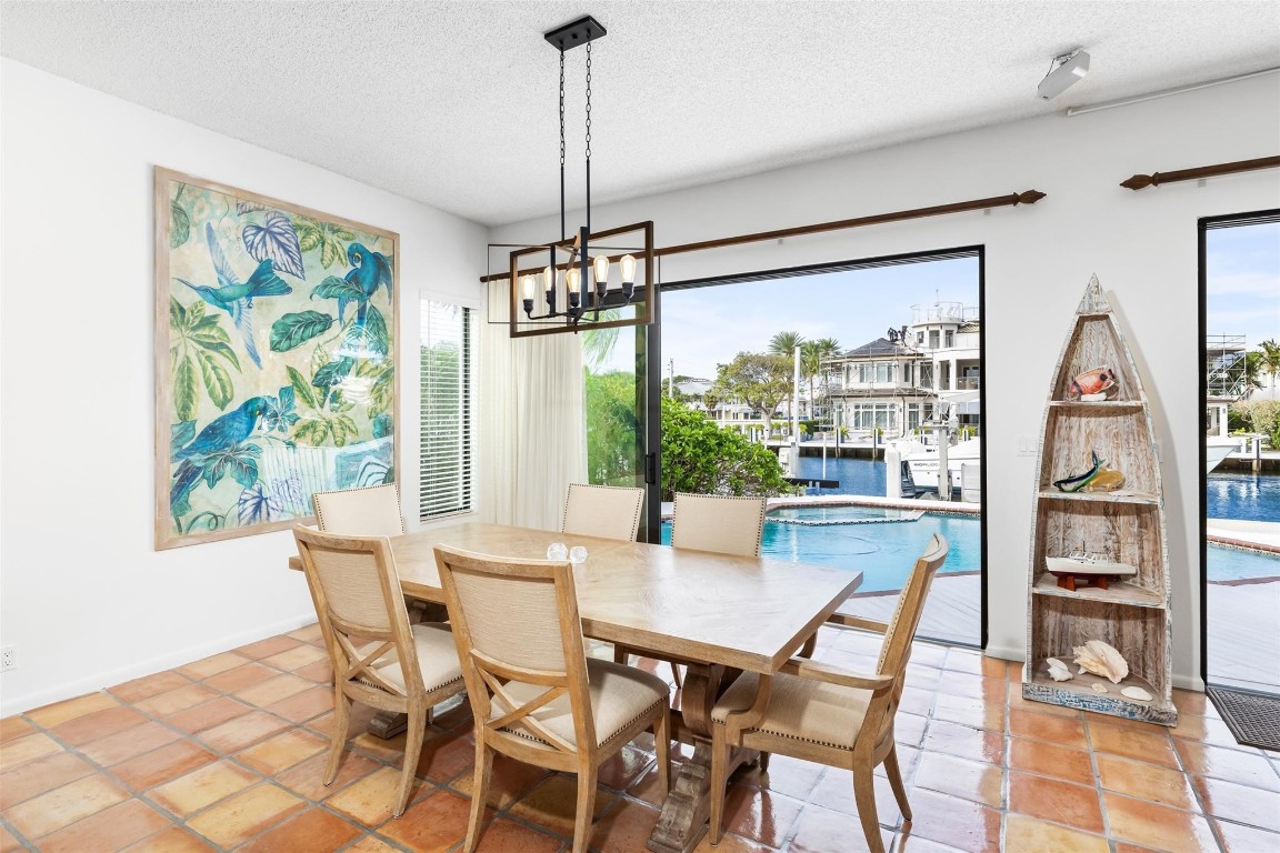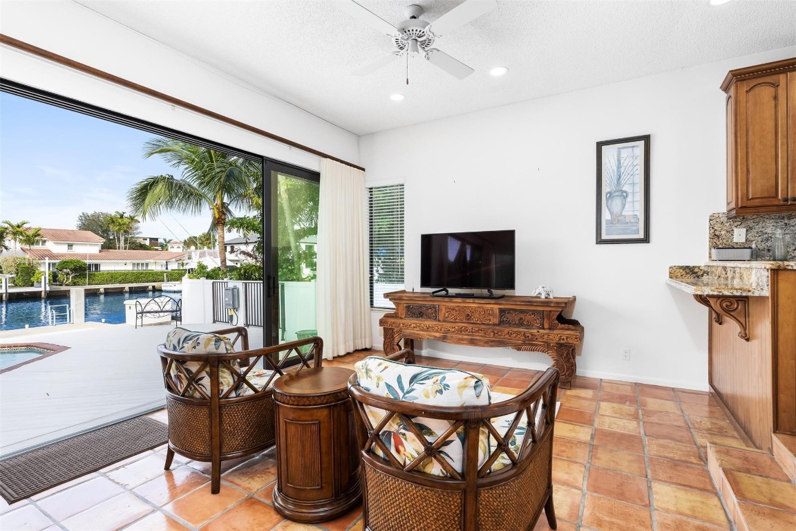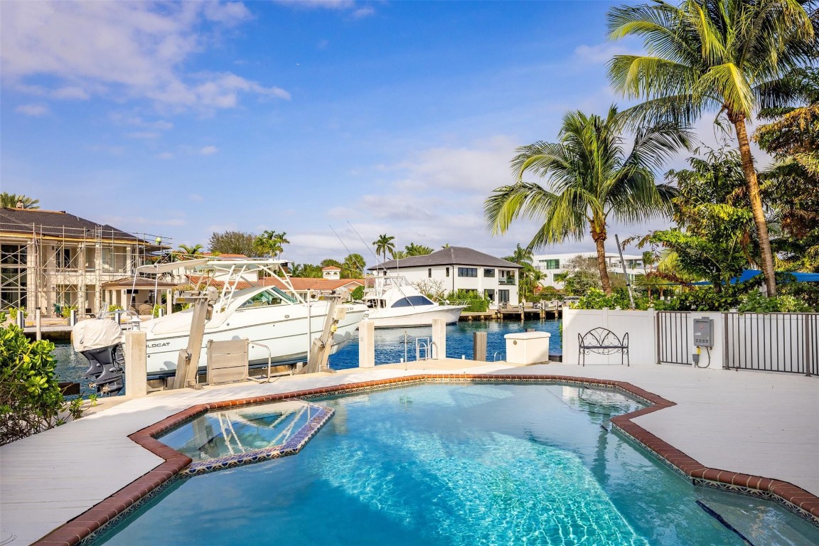 Discover your dream waterfront oasis in Rio Vista Isles! This 4BR/3BA gem offers expansive open living spaces with vaulted ceilings, a cozy fireplace in the living room, and walls of sliders providing breathtaking water views. The well-appointed kitchen features hardwood cabinetry, granite countertops, stainless appliances, and a breakfast bar, with a closet-sized pantry for ample storage. The ground floor bedroom doubles as a home office. Ascend the impressive staircase to your master retreat with a custom walk-in closet, a private sitting room, and a serene waterfront terrace. Two more bedrooms and a guest bath await. Enjoy outdoor living with an elevated pool, spa, a spacious deck & a 50FT new full-service concrete dock & seawall, boat lift, jet ski lift & floating dock for your kayaks!