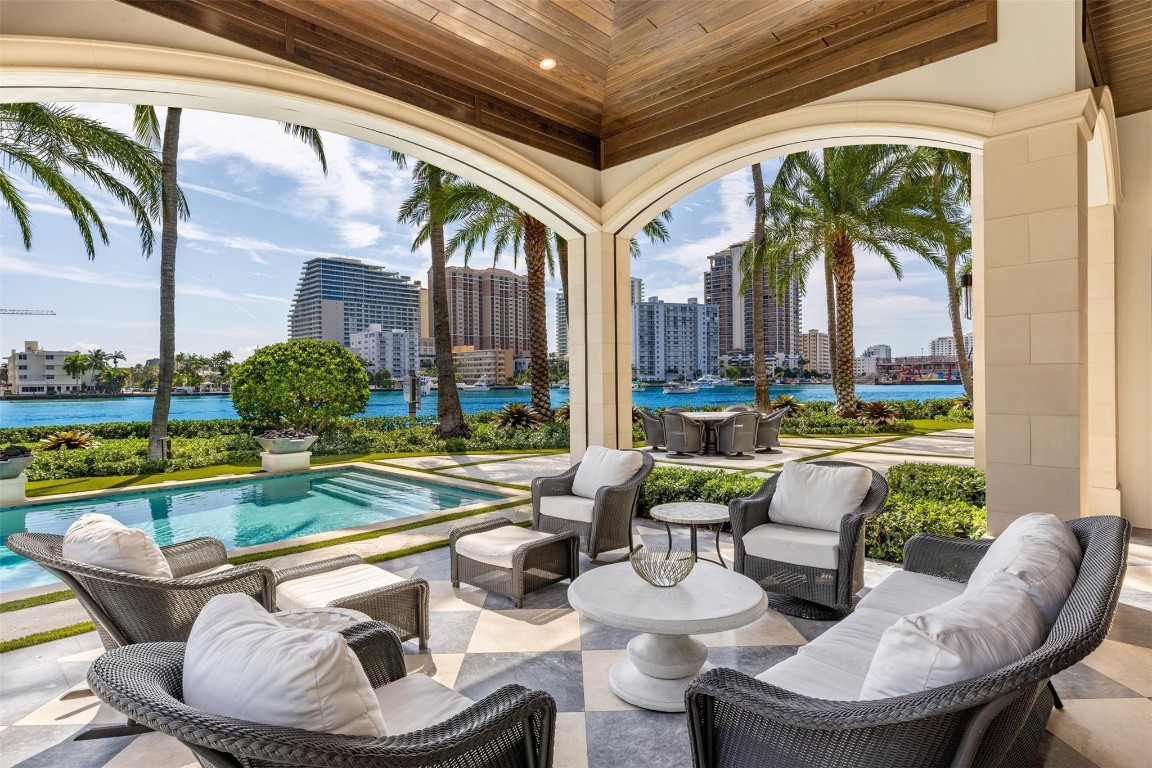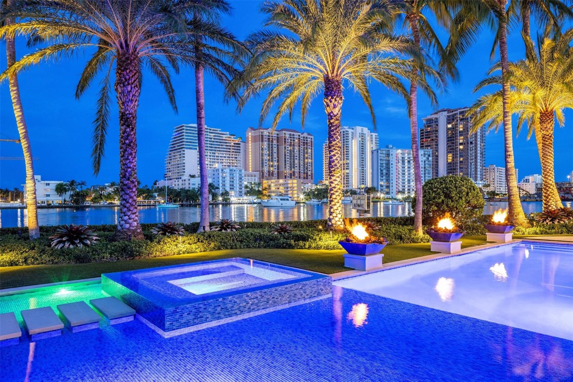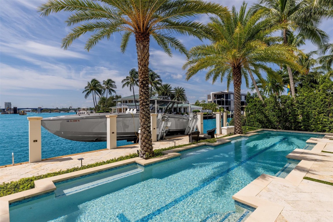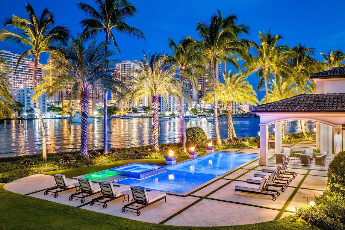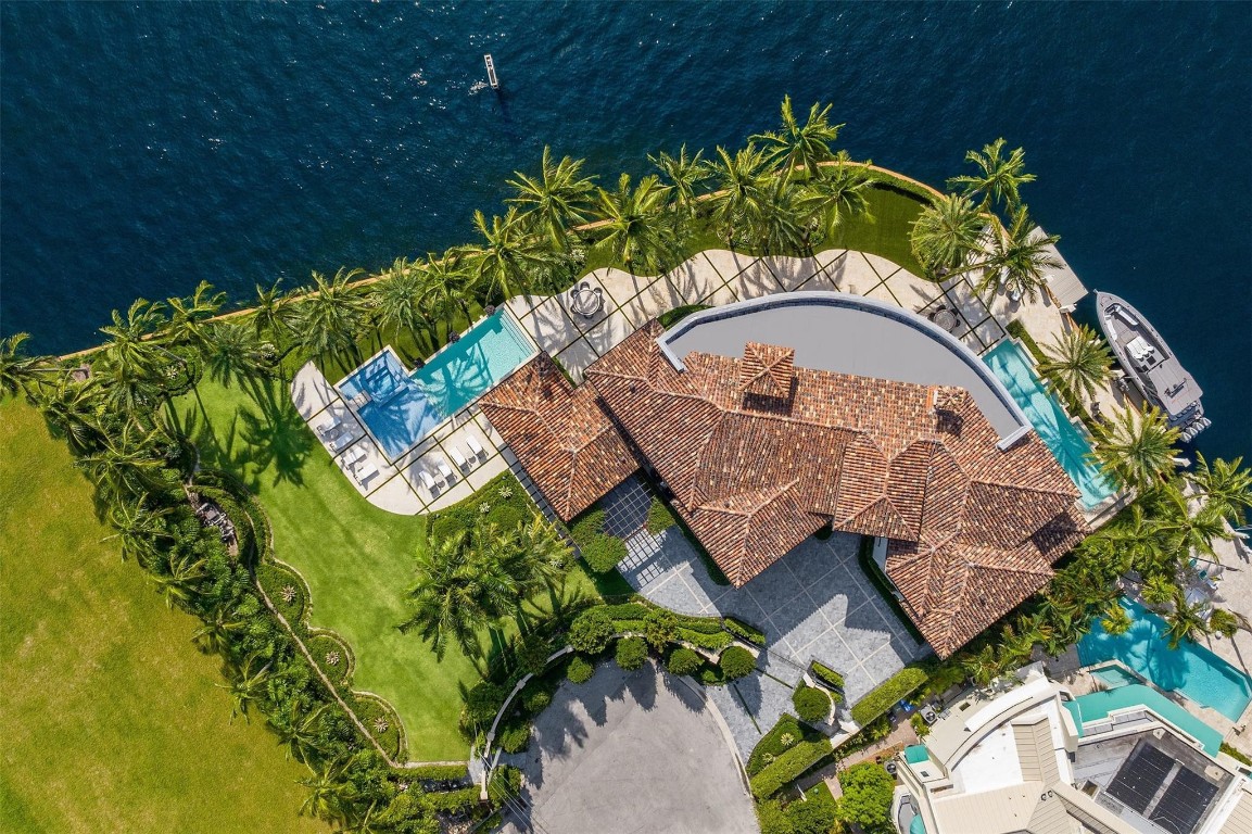 Step into a world of private island allure at this exceptional point lot crafted along the shores of the Intracoastal in the prestigious security patrolled Seven Isles neighborhood. This expertly manicured, gated, RARE double lot spanning over a half acre, boasts two pools, covered entertaining areas, ample room for expansion, & 325' of highly desirable SE exposure WF. Find timeless yet transitional elegance paired with the finest finishes throughout. Upstairs, find an oversized Primary Suite with panoramic views and a stunning private terrace. 2021 Renovations by Gulf Building include top-of-the-line construction materials, finishes, & security. Please refer to the last photos on the listing for Architect's proposed +/- 2500 AC SF addition and features.
