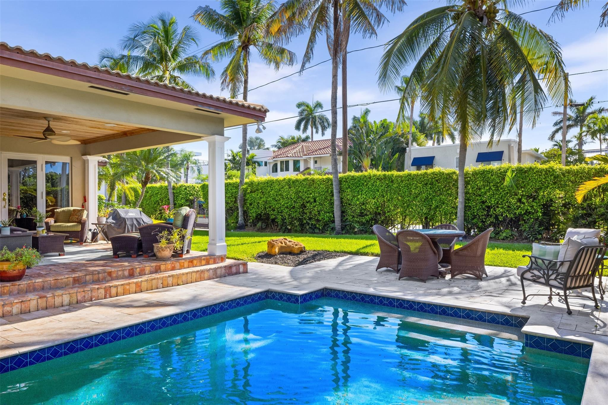 Introducing 359 Poinciana Drive! This stunning residence is located in the coveted Idlewyld community, just steps away from the iconic Las Olas Blvd. This 3-bed, 3.5-bath home is on an 8,625SF lot with lots of greenery. Meticulously remodeled, it features a chef's kitchen, wood floors, high-impact windows & a beautiful yard/pool area. Step outside into your private, lush oasis and find a covered veranda and sitting area with a wood ceilingoverlooking the pool, ideal for unwinding in the Florida sunshine. Situated on a corner lot, the home also features anentry gate for privacy with pavers. Location, location, location! Located within walking distance to Fort Lauderdale Beach, fine dining, shopping and everything else FTL has to offer. The perfect retreat for South Florida living!